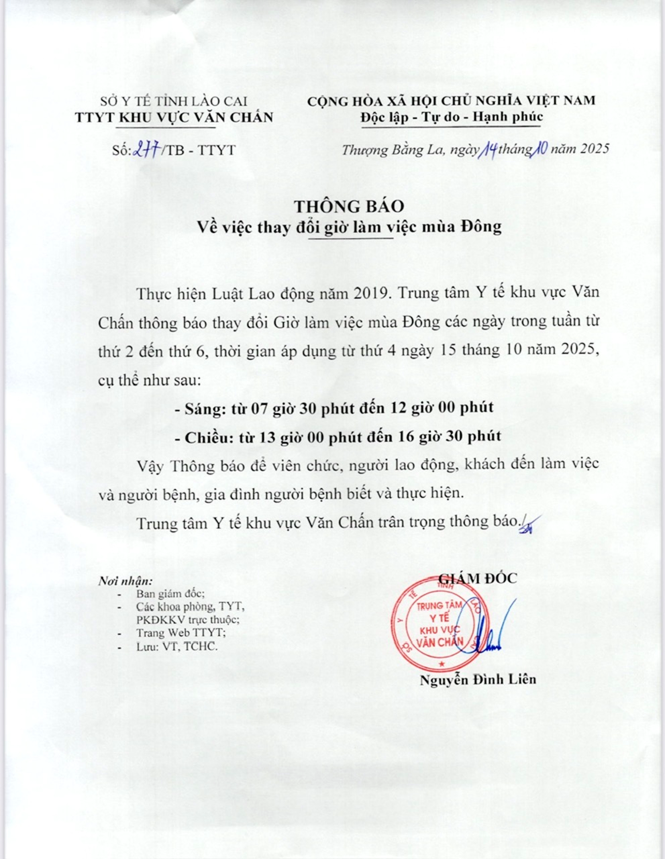 TRUNG TÂM Y TẾ KHU VỰC VĂN CHẤN THÔNG BÁO VỀ VIỆC THAY ĐỔI GIỜ LÀM VIỆC MÙA ĐÔNG